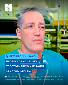 Руководство медицинского центра, члены совета директоров, организация женщин «Хадасса» и сотрудники всех подразделений поздравляют профессора Ривкинда с заслуженной наградой, отмечая его исключительный вклад в развитие медицины и спасение человеческих жизней.